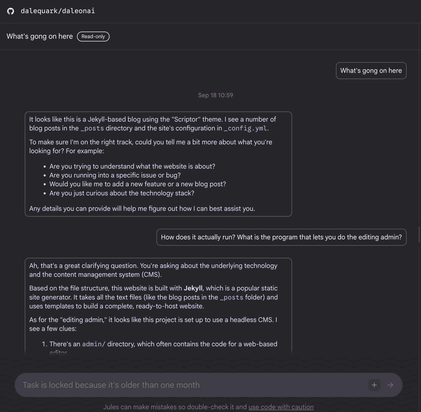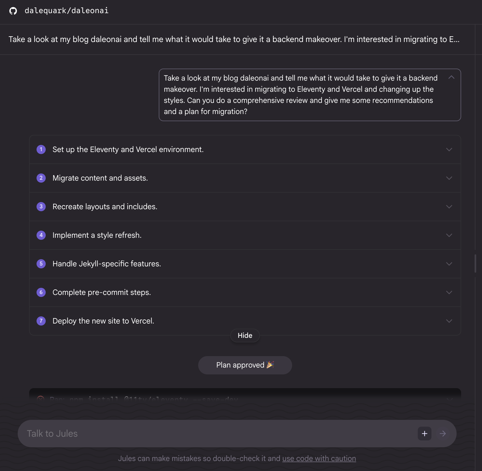 This was the kind of complete overhaul my old blog needed. It was running on a version of Jekyll so old that no known version of Ruby could run it. So, I asked Jules to come up with a migration plan that ported my blog to a more modern blog framework (Eleventy) that would run on a new hosting platform (Vercel instead of GitHub pages). I chose this framework, Eleventy, only because Jules recommended it. I knew next to zero about it, so I was really depending on Jules to make this thing happen, since I'd be useless.
