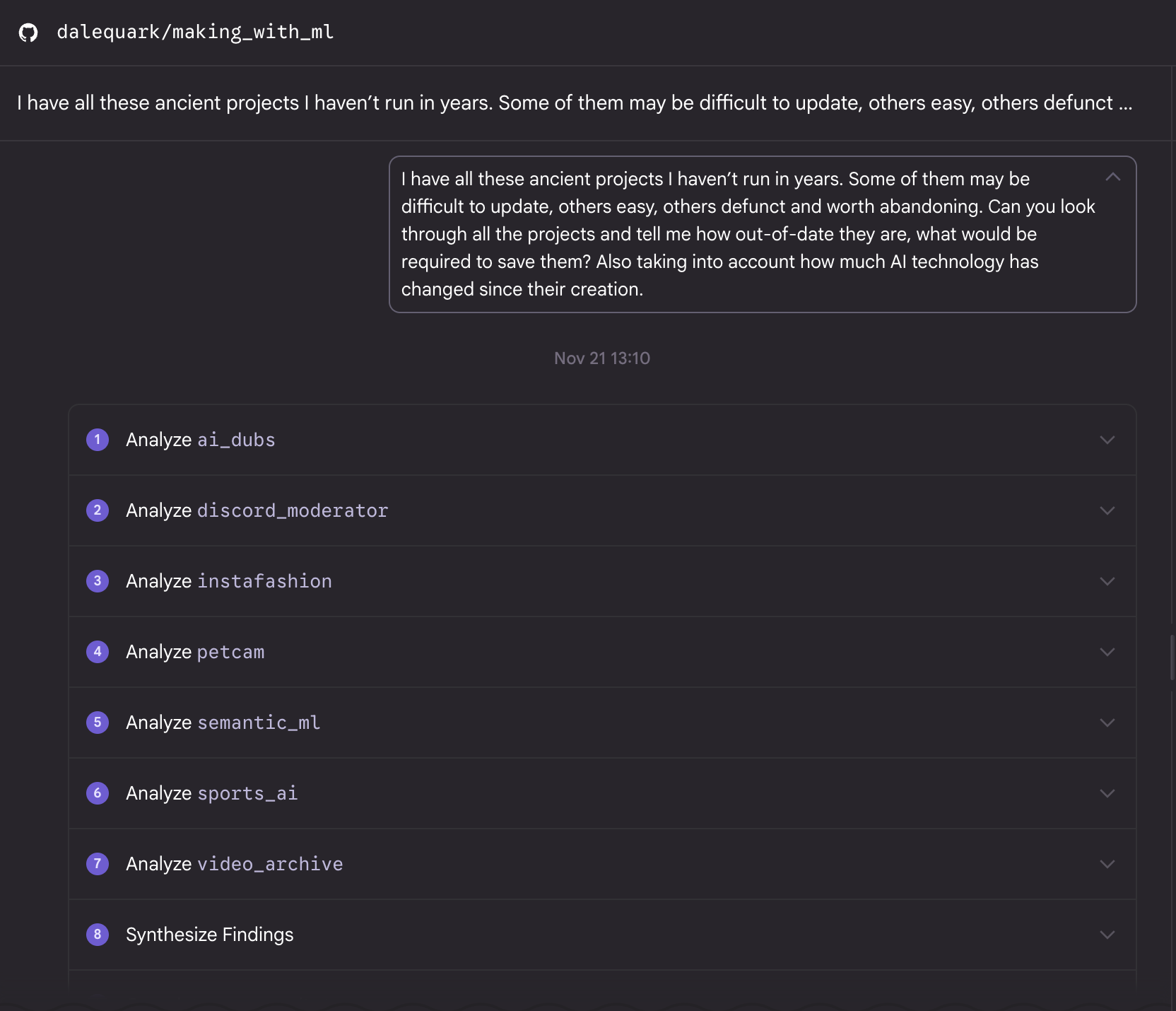 For example, I asked Jules to assess the status of seven code projects in my making_with_ml mono repo. This repo, which contains now-completely-outdated machine learning projects that went along with my Making With ML YouTube series, contains all manner of project: from simple scripts to Jupyter notebooks, Flutter apps, React apps, backends, frontends, cloud configurations–the whole range. So, I thought it was a good candidate to tell me what kind of projects Jules would be good at fixing: