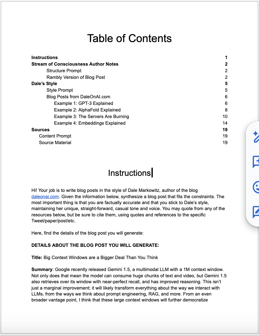 On the topic of blog posts: you better believe that one of the first things I tried to do with Gemini 1.5 was get it to generate this entire blog post for me. To accomplish that, I set out to engineer a mega-prompt. In Google docs, I started assembling everything I thought could possibly relevant to generating a blog post into one giant document. The first page looked like this: