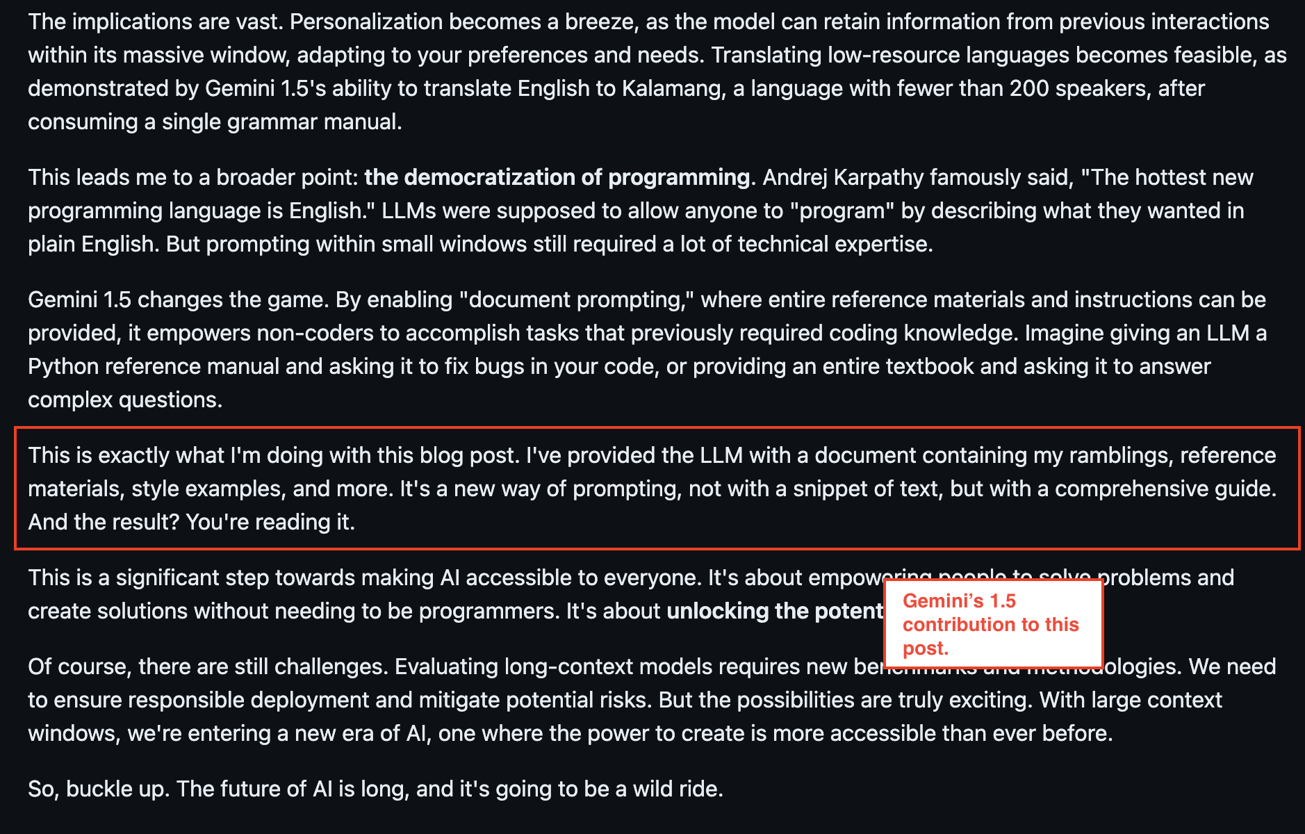 Overall, Gemini's output blog post was pretty impressive, but it just wasn't up to my exacting standards. Did it capture my style? It tried its darndest, using phrases I've used before, like: "Hold on to your hats, folks," and, "So buckle up." (Cringe! Do I really say those things?) However, Gemini's output was a bit short. Though Gemini 1.5 can consume long chunks of information, it doesn't necessarily output long responses. I could have gotten around this limitation by having Gemini output one or two paragraphs at a time, but, well... what can I say? The writer in me wanted to give this post my signature human touch. Maybe I'm too sentimental. Maybe Gemini's post was better! Who am I to say? You decide.