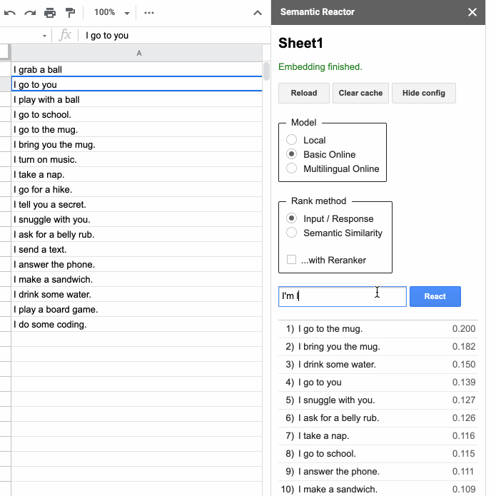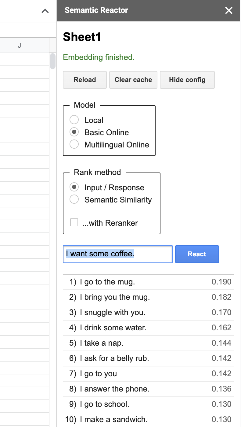 When you hit "React", Semantic Reactor uses a model to embed all of the responses you've written in that first column, calculate a score (how good a response is this sentence to the query?), and sorts the results. For example, when my input was "I want some coffee," the top ranked responses from my spreadsheet were, "I go to the mug" and "I bring you the mug."